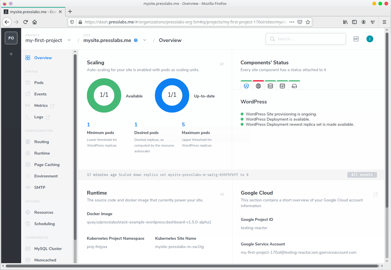 This tutorial will guide you to create your first organization, how you can group sites in projects and how you can launch with a click new sites that scale up and down automatically, as needed.